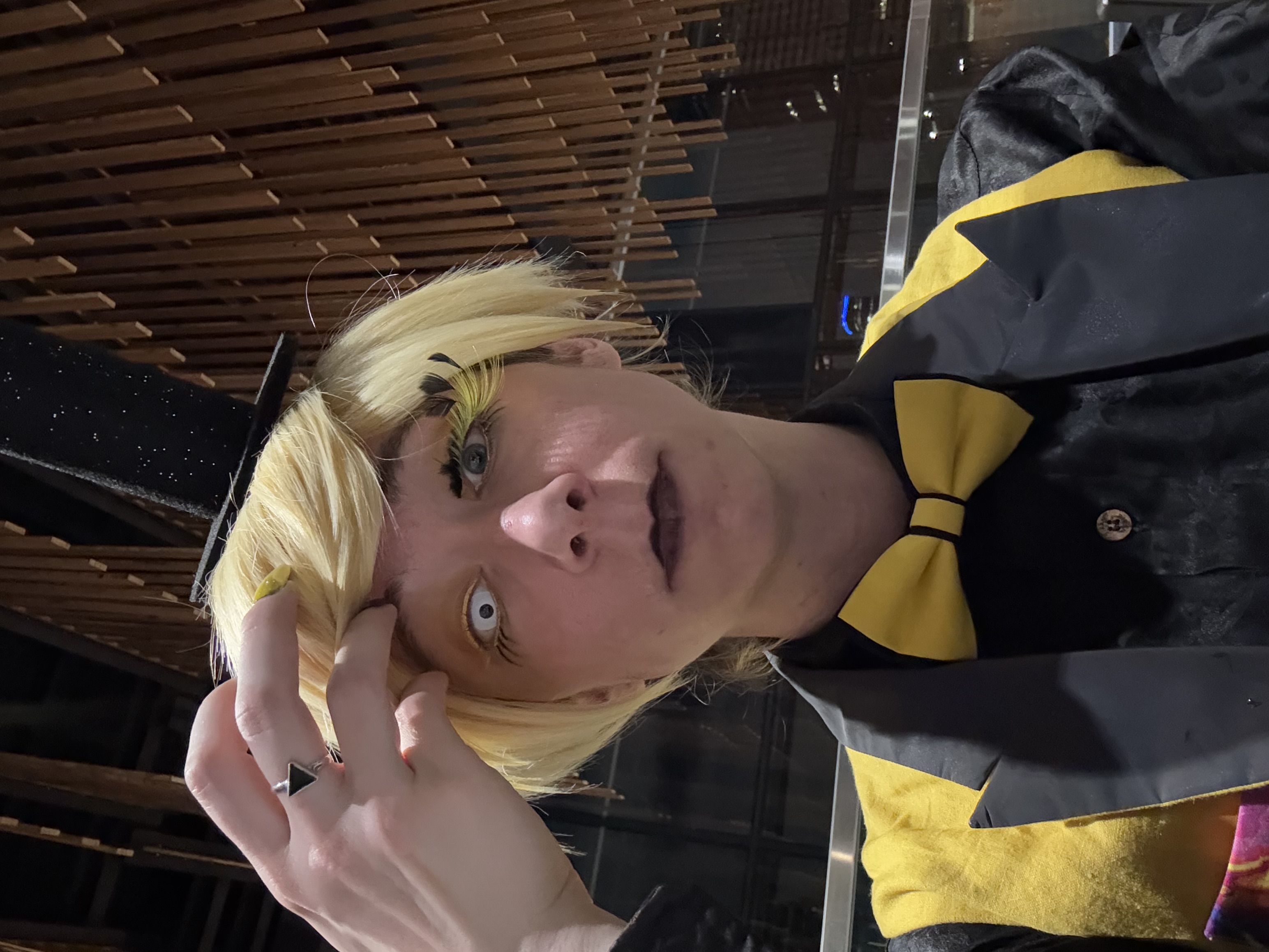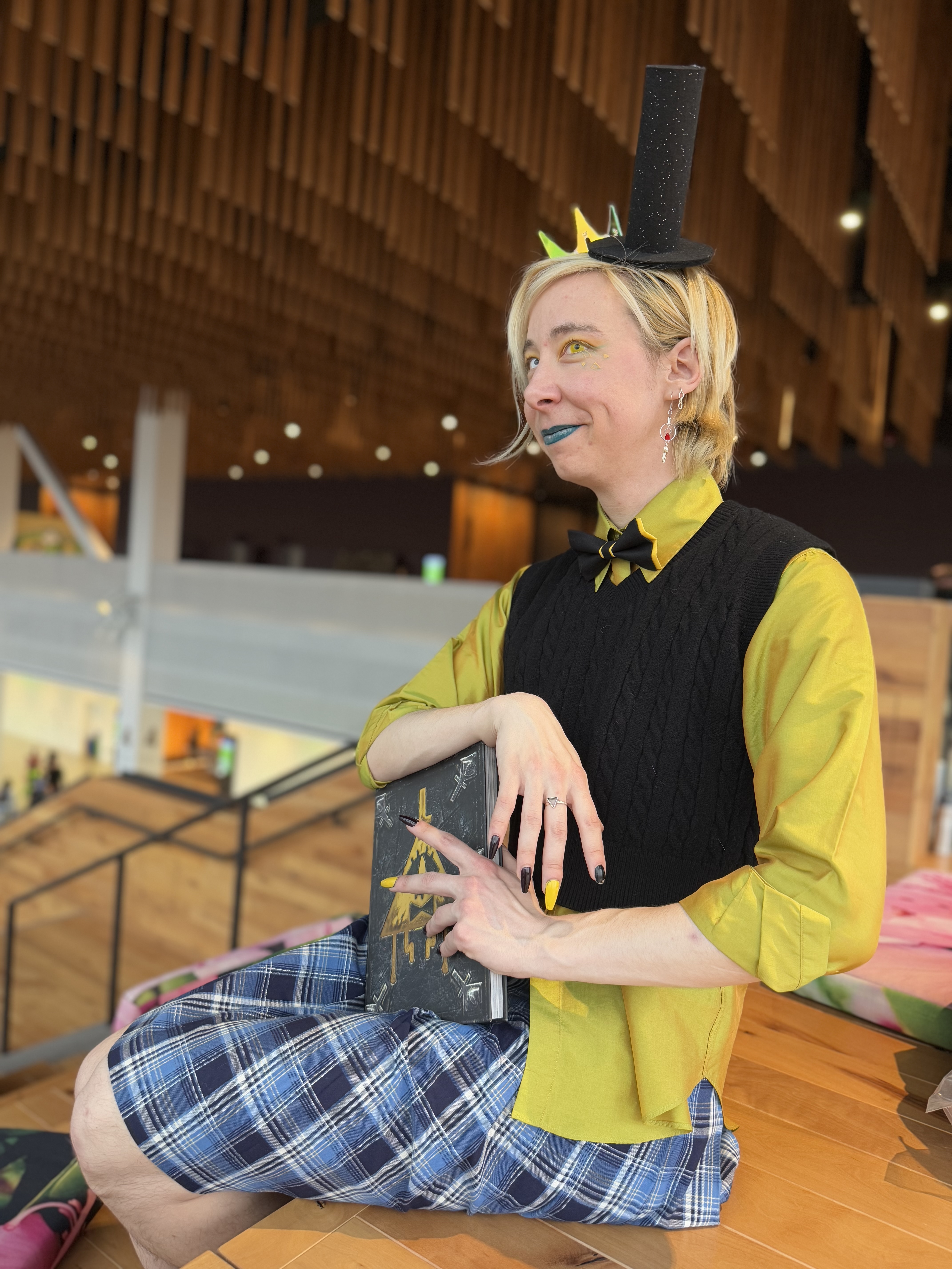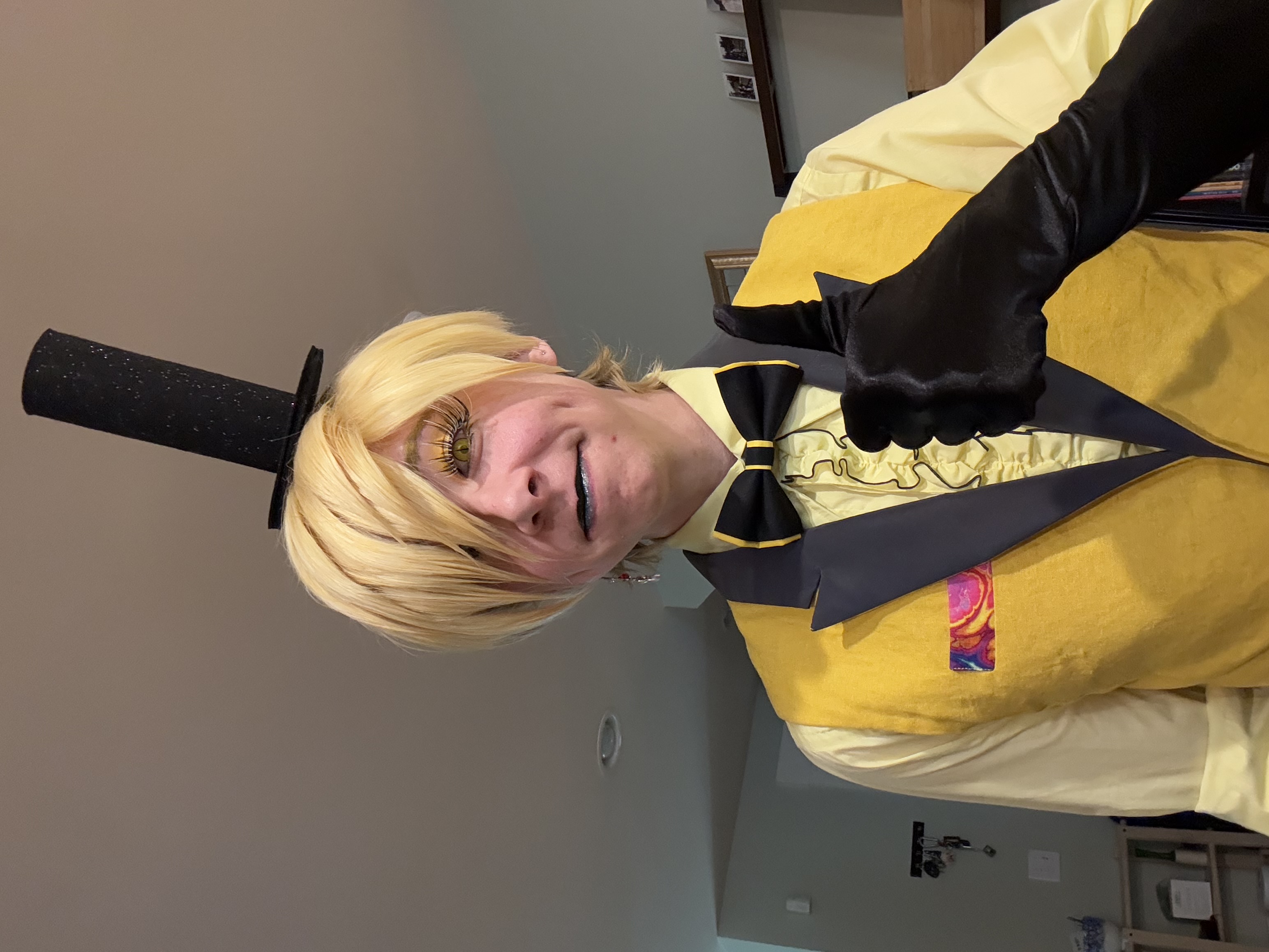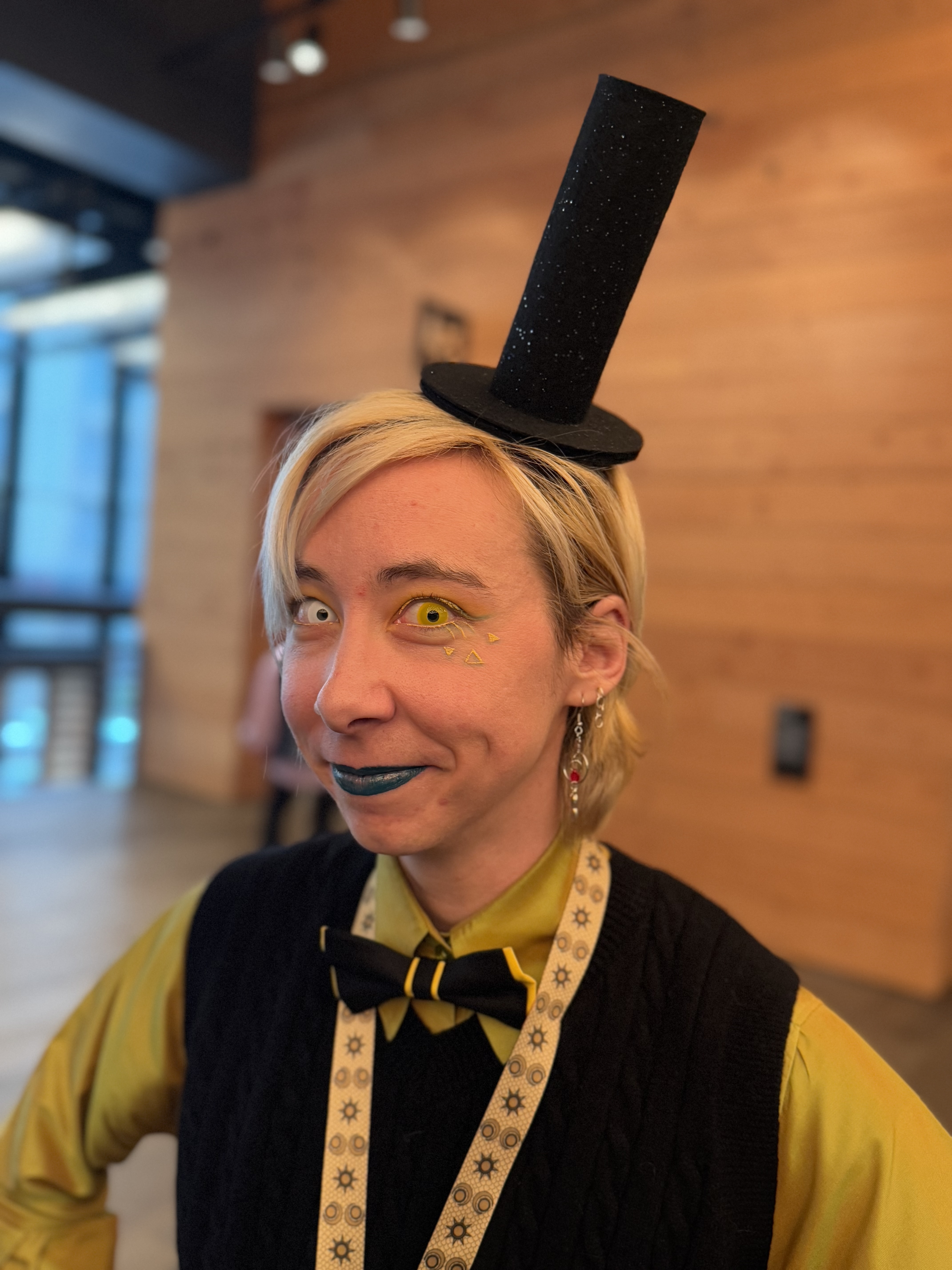 With such a simple character design to start with I wanted to make sure I capture the key elements to make my own design distinctively and clearly Bill: triangles, yellow and black, top hat, bow tie, one eye, eyelashes, brick pattern. I decided on tumblr-esque top hat and tails look but with a vest so that I could replicate the yellow body and black arms. I liked the sweeping bangs covering the eye, and the mini top hat. I decided to focus most of my efforts on creating the custom vest, with a relatively simple (bought not sewn) base yellow/black outfit. I wanted to include blue or iridescent or rainbow/neon elements as well, for the Weirdmaggedon/alternate dimension imagery he's associated with even if these are not directly included in his design. To that end I looked for photoreflective fabric to try out for certain elements. I found a great melty rainbow swirl fabric as well, that looked JUST like the Weirdmageddon rift. Once I got those and a nice color of plain yellow cotton, I had my design and my main materials ready to go!