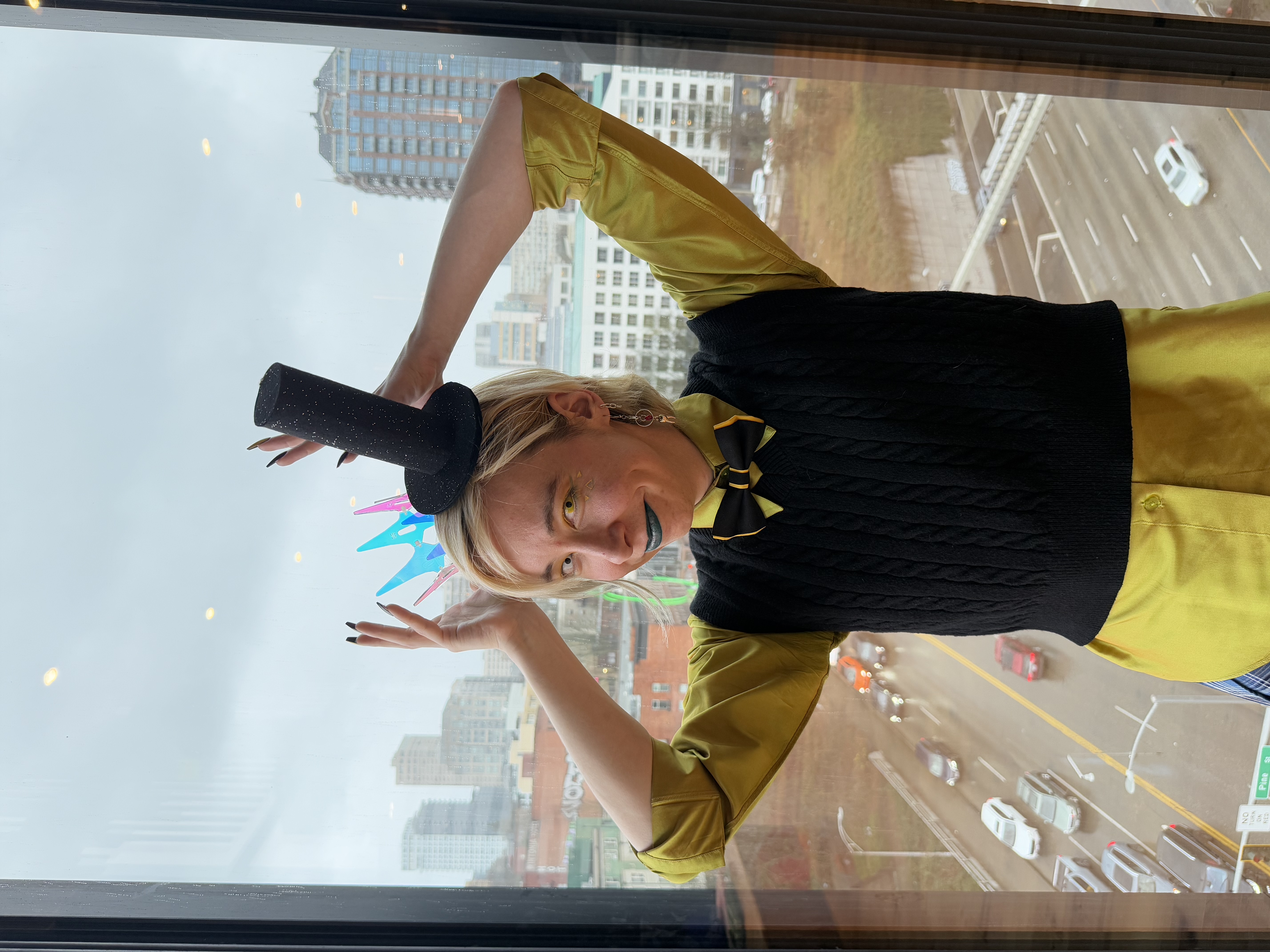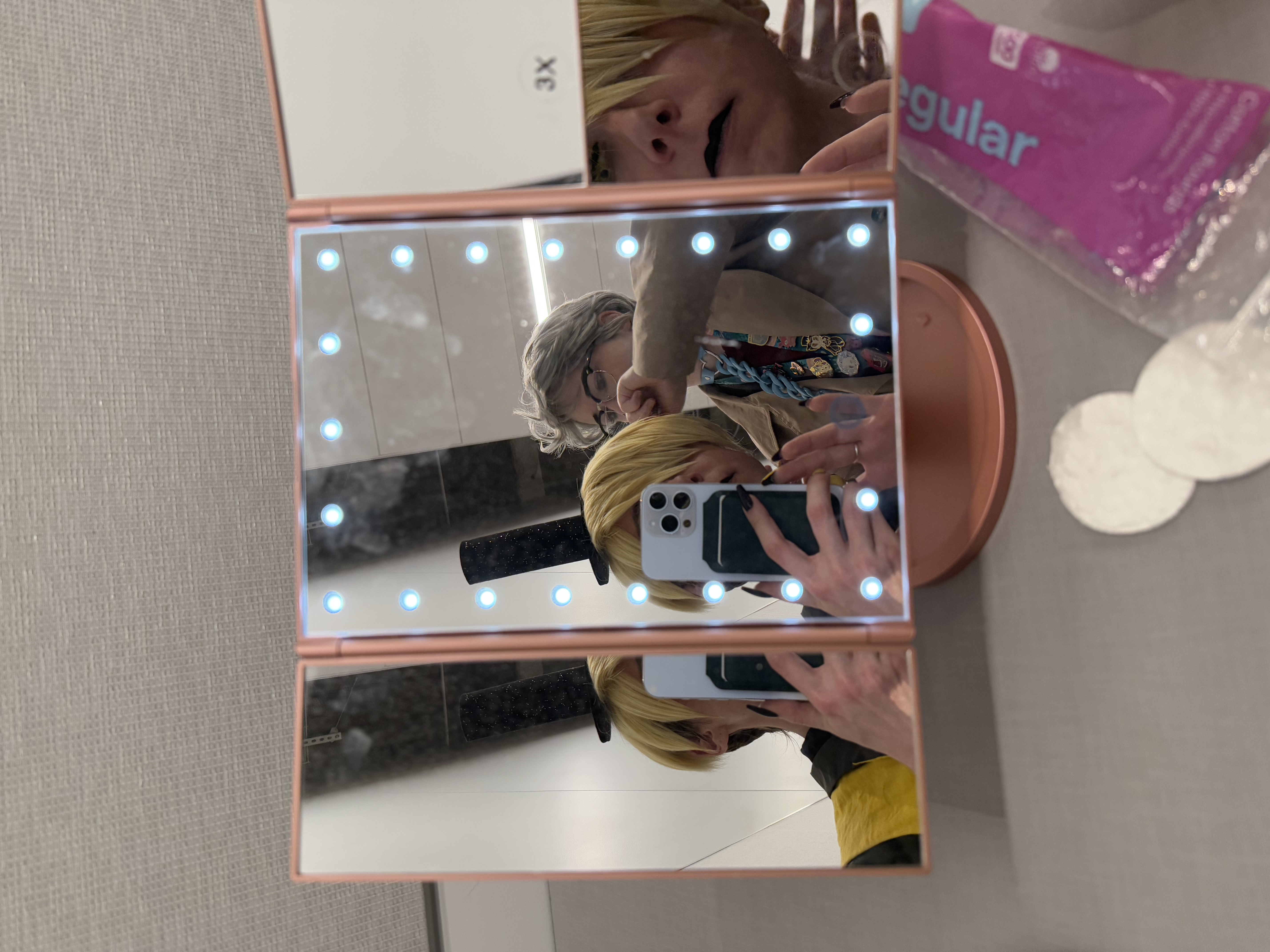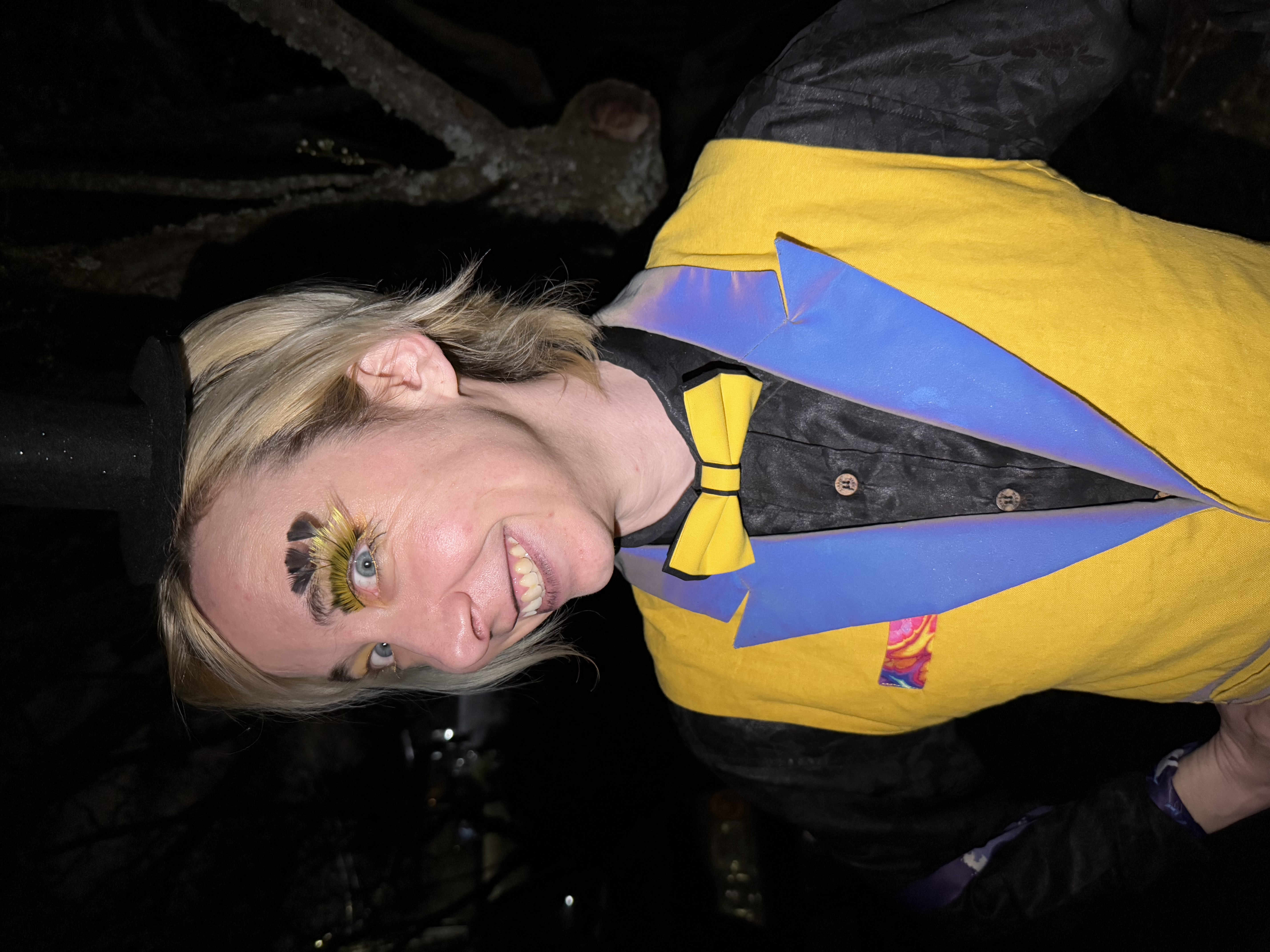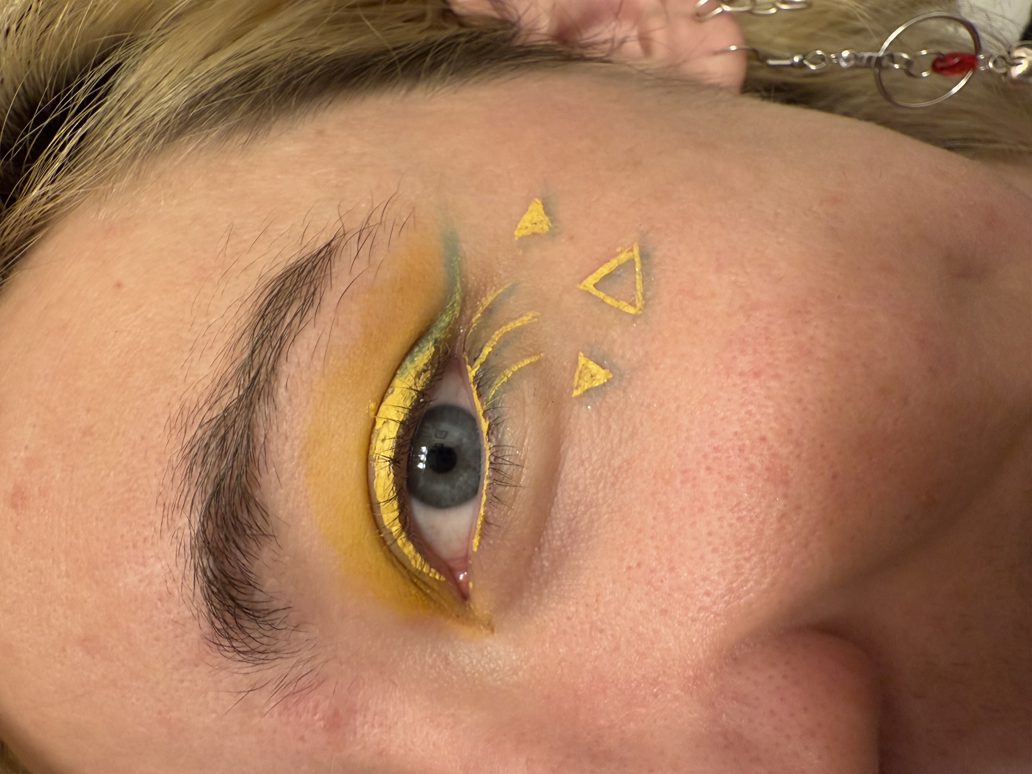 With such a simple character design to start with I wanted to make sure I capture the key elements to make my own design distinctively and clearly Bill: triangles, yellow and black, top hat, bow tie, one eye, eyelashes, brick pattern. I decided on tumblr-esque top hat and tails look but with a vest so that I could replicate the yellow body and black arms. I liked the sweeping bangs covering the eye, and the mini top hat. I decided to focus most of my efforts on creating the custom vest, with a relatively simple (bought not sewn) base yellow/black outfit. I wanted to include blue or iridescent or rainbow/neon elements as well, for the Weirdmaggedon/alternate dimension imagery he's associated with even if these are not directly included in his design. To that end I looked for photoreflective fabric to try out for certain elements. I found a great melty rainbow swirl fabric as well, that looked JUST like the Weirdmageddon rift. Once I got those and a nice color of plain yellow cotton, I had my design and my main materials ready to go!