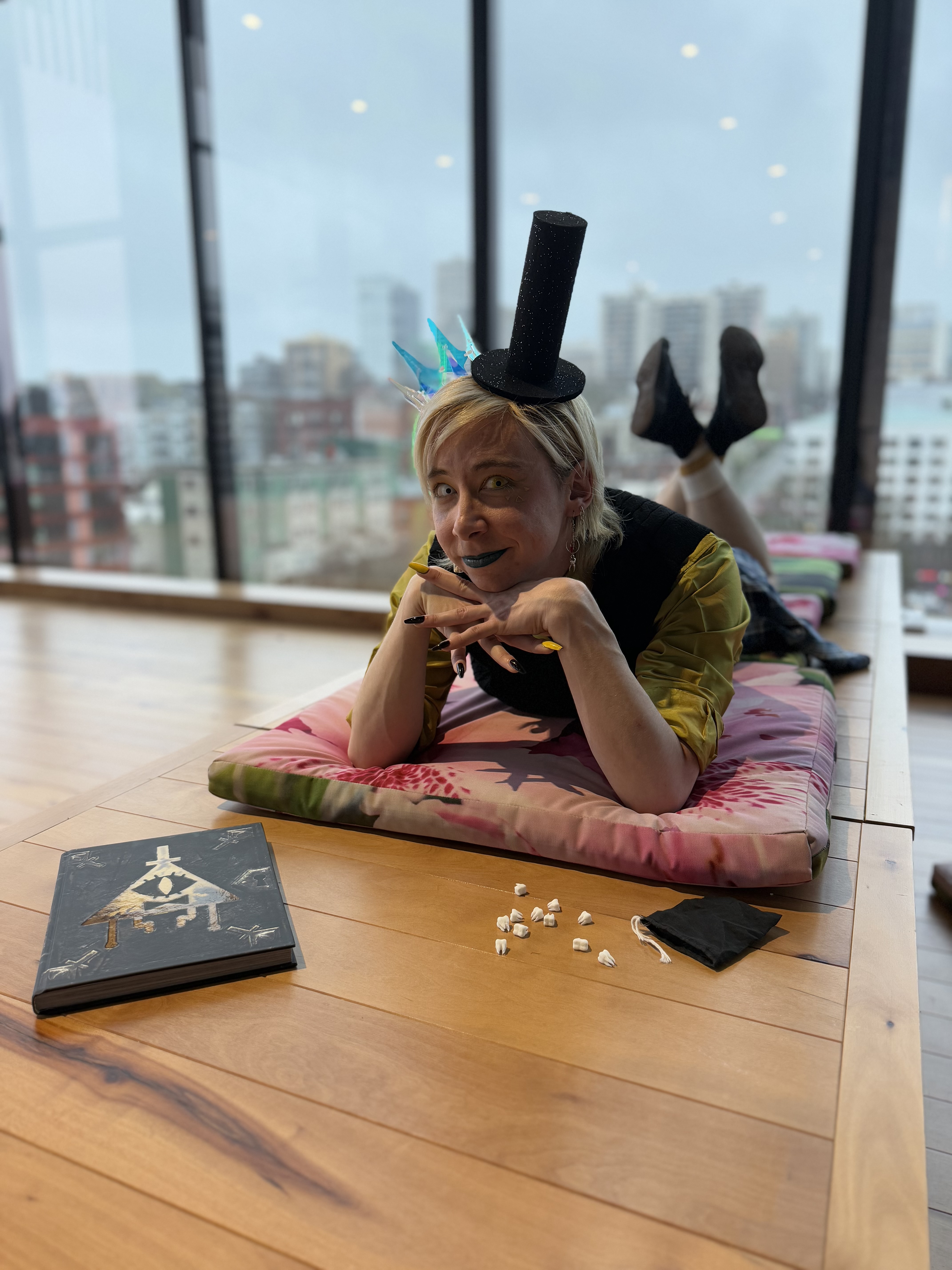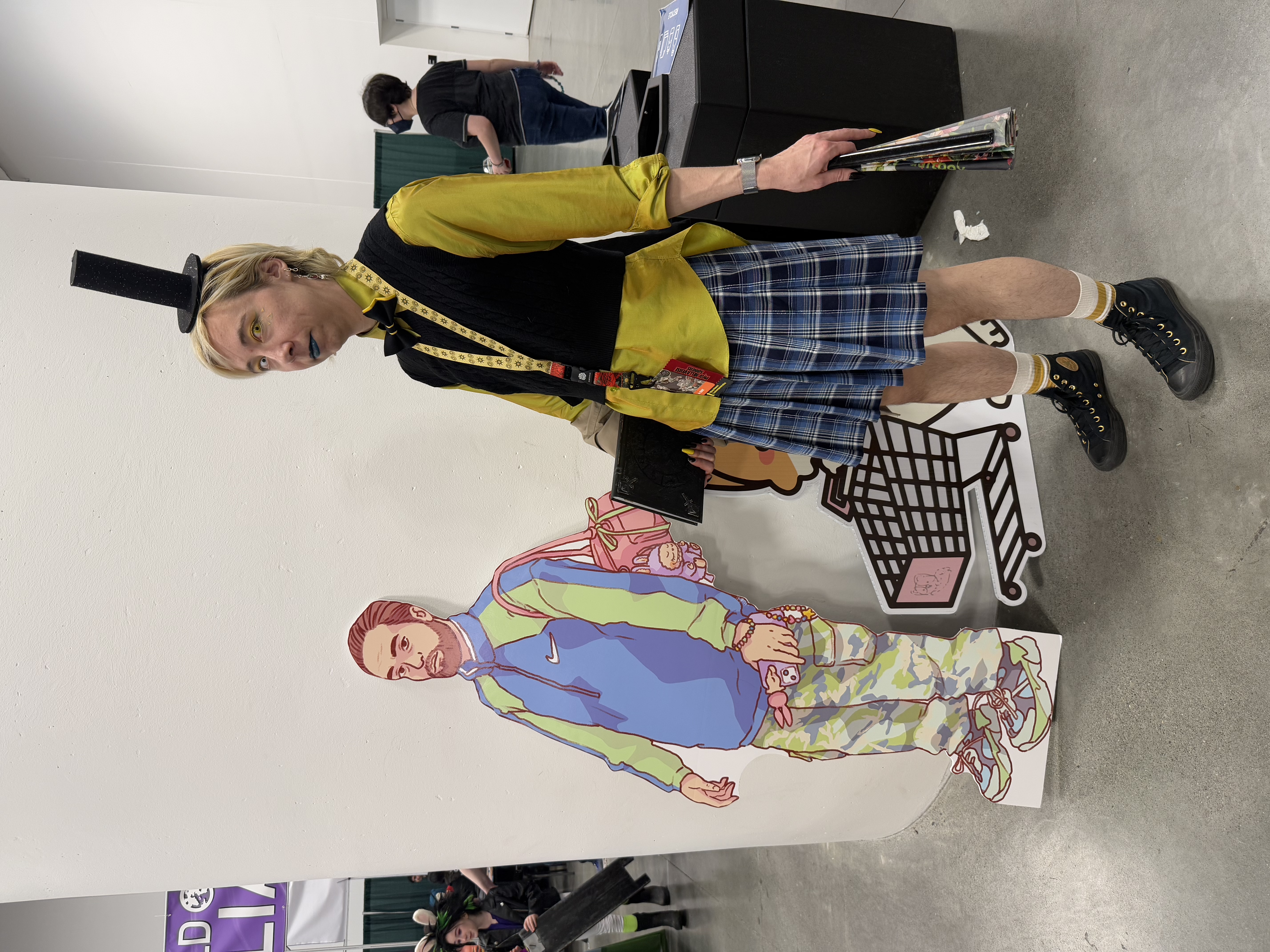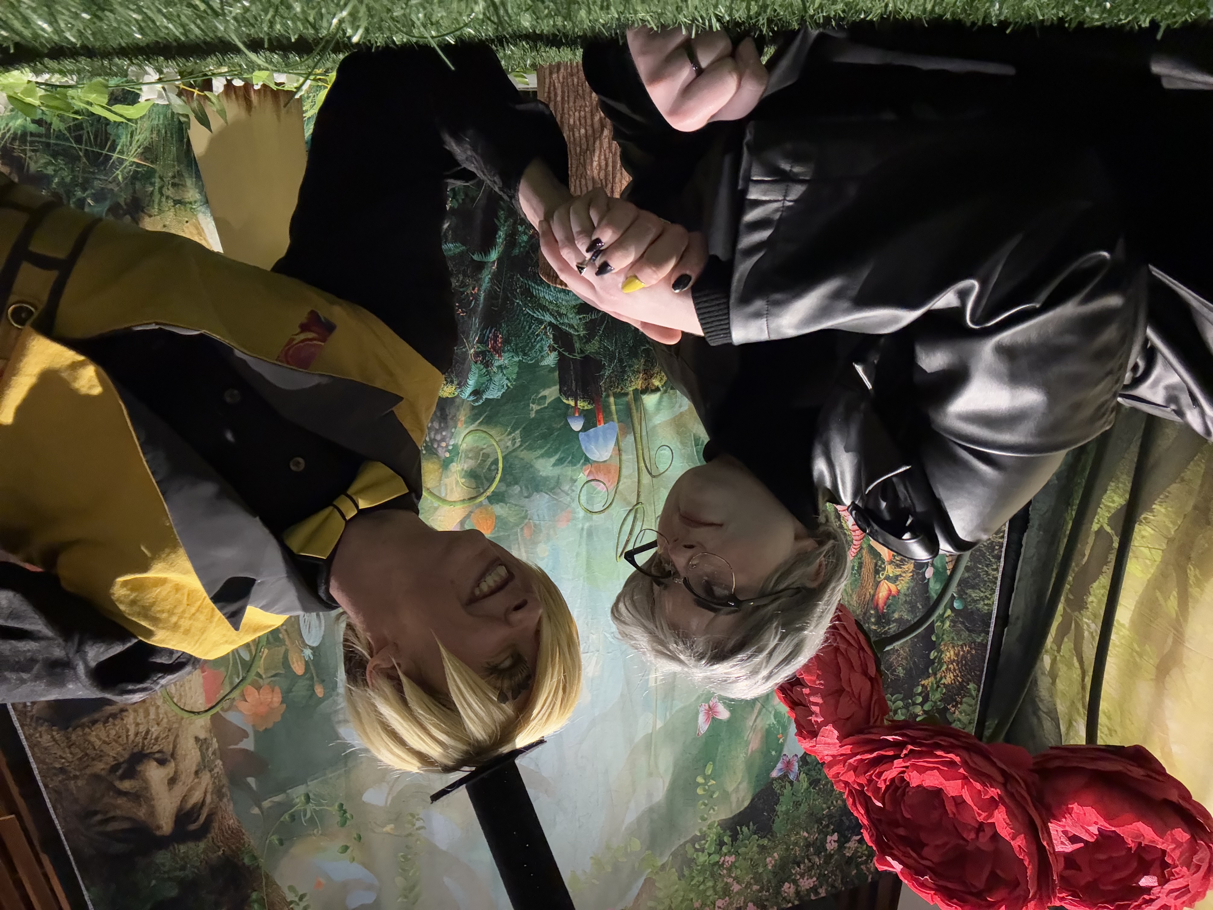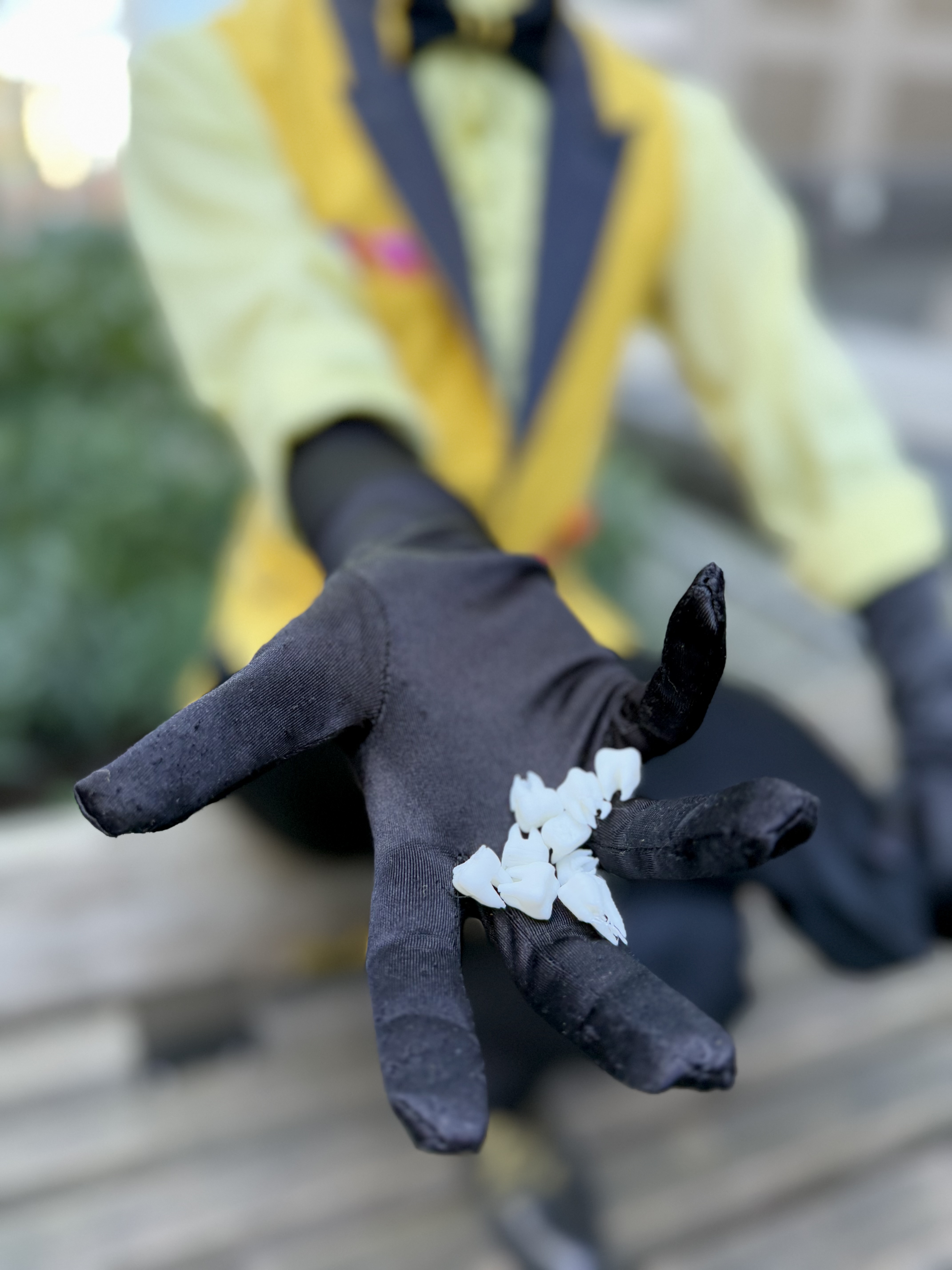 With such a simple character design to start with I wanted to make sure I capture the key elements to make my own design distinctively and clearly Bill: triangles, yellow and black, top hat, bow tie, one eye, eyelashes, brick pattern. I decided on tumblr-esque top hat and tails look but with a vest so that I could replicate the yellow body and black arms. I liked the sweeping bangs covering the eye, and the mini top hat. I decided to focus most of my efforts on creating the custom vest, with a relatively simple (bought not sewn) base yellow/black outfit. I wanted to include blue or iridescent or rainbow/neon elements as well, for the Weirdmaggedon/alternate dimension imagery he's associated with even if these are not directly included in his design. To that end I looked for photoreflective fabric to try out for certain elements. I found a great melty rainbow swirl fabric as well, that looked JUST like the Weirdmageddon rift. Once I got those and a nice color of plain yellow cotton, I had my design and my main materials ready to go!