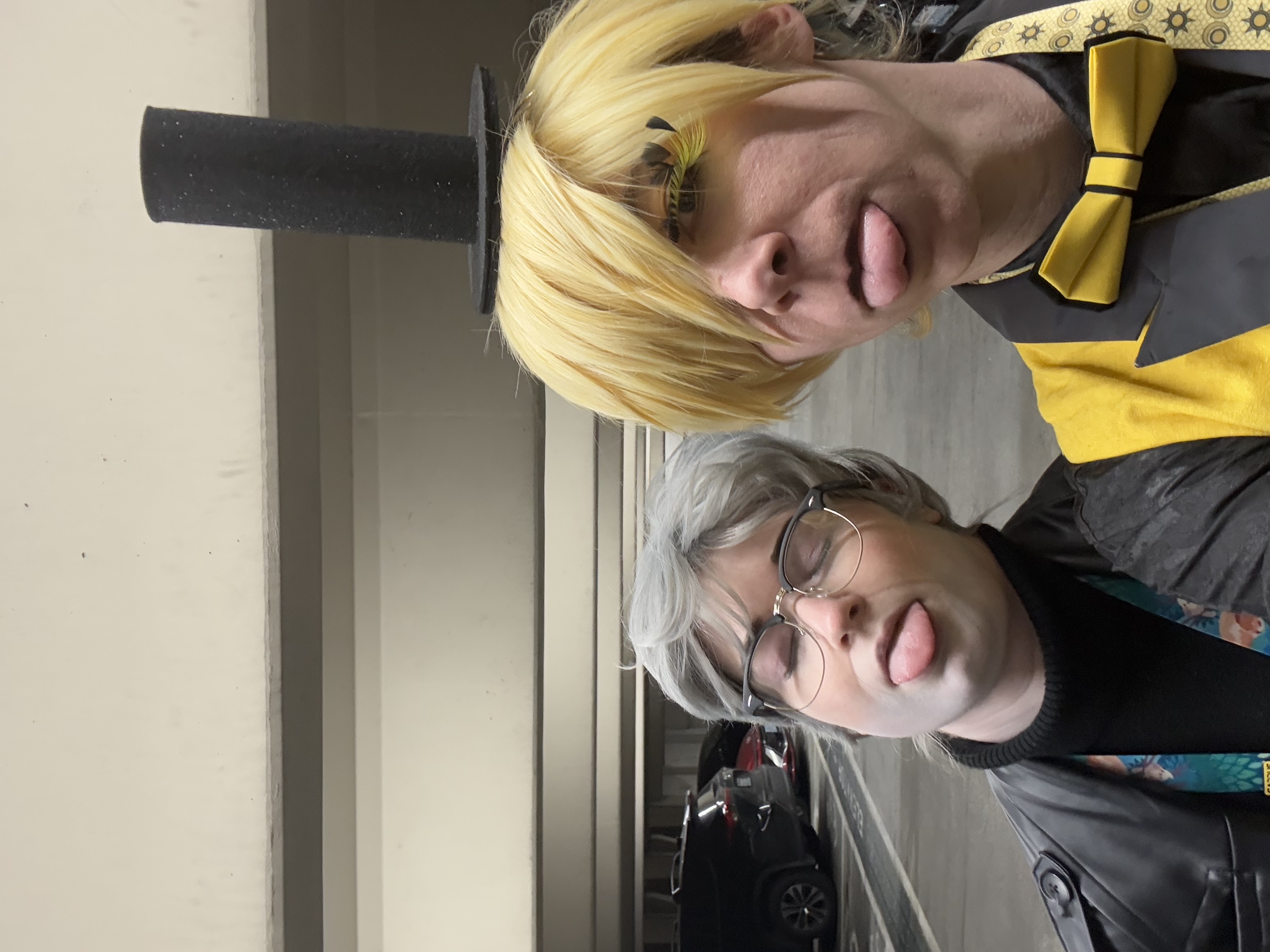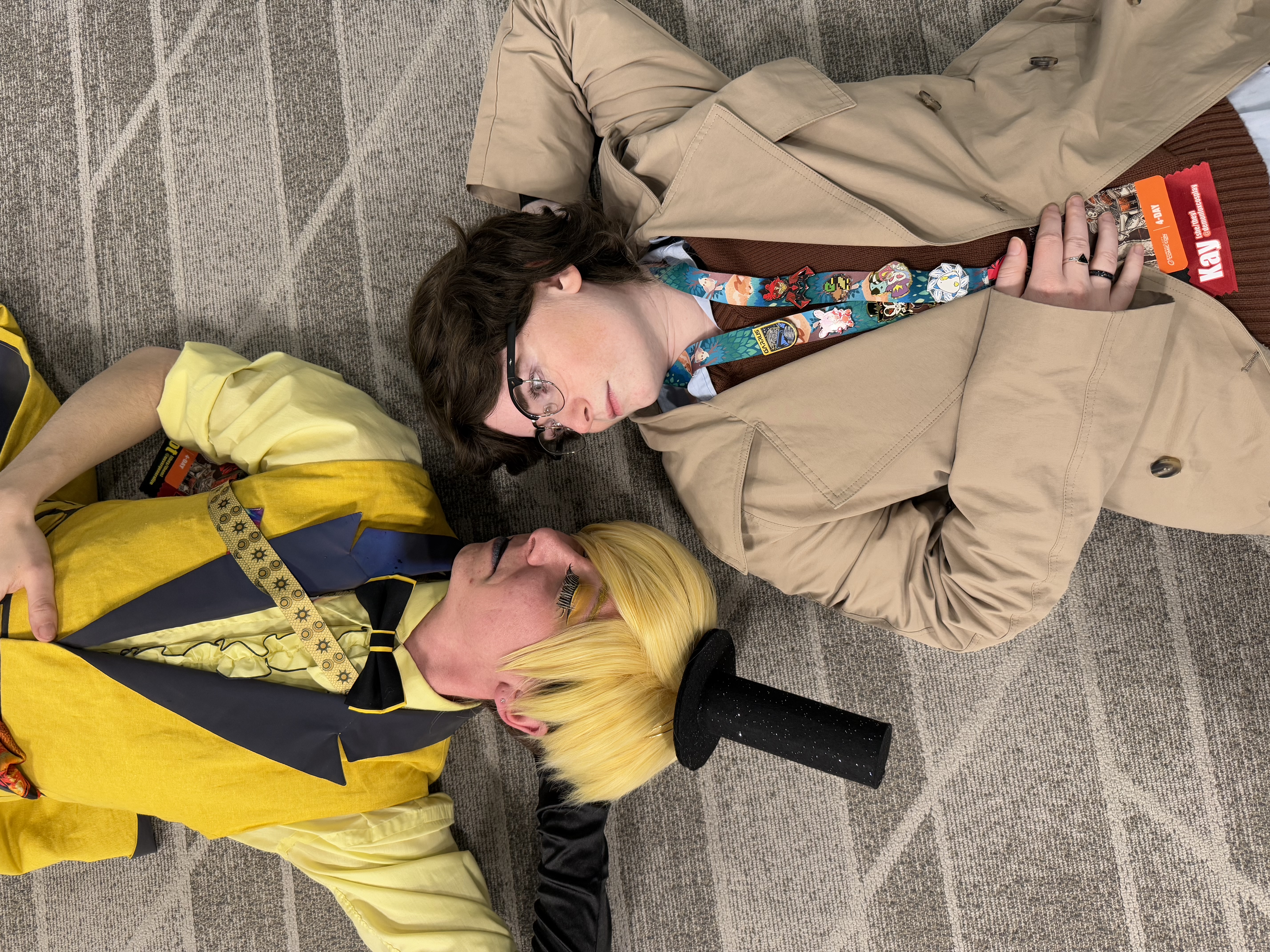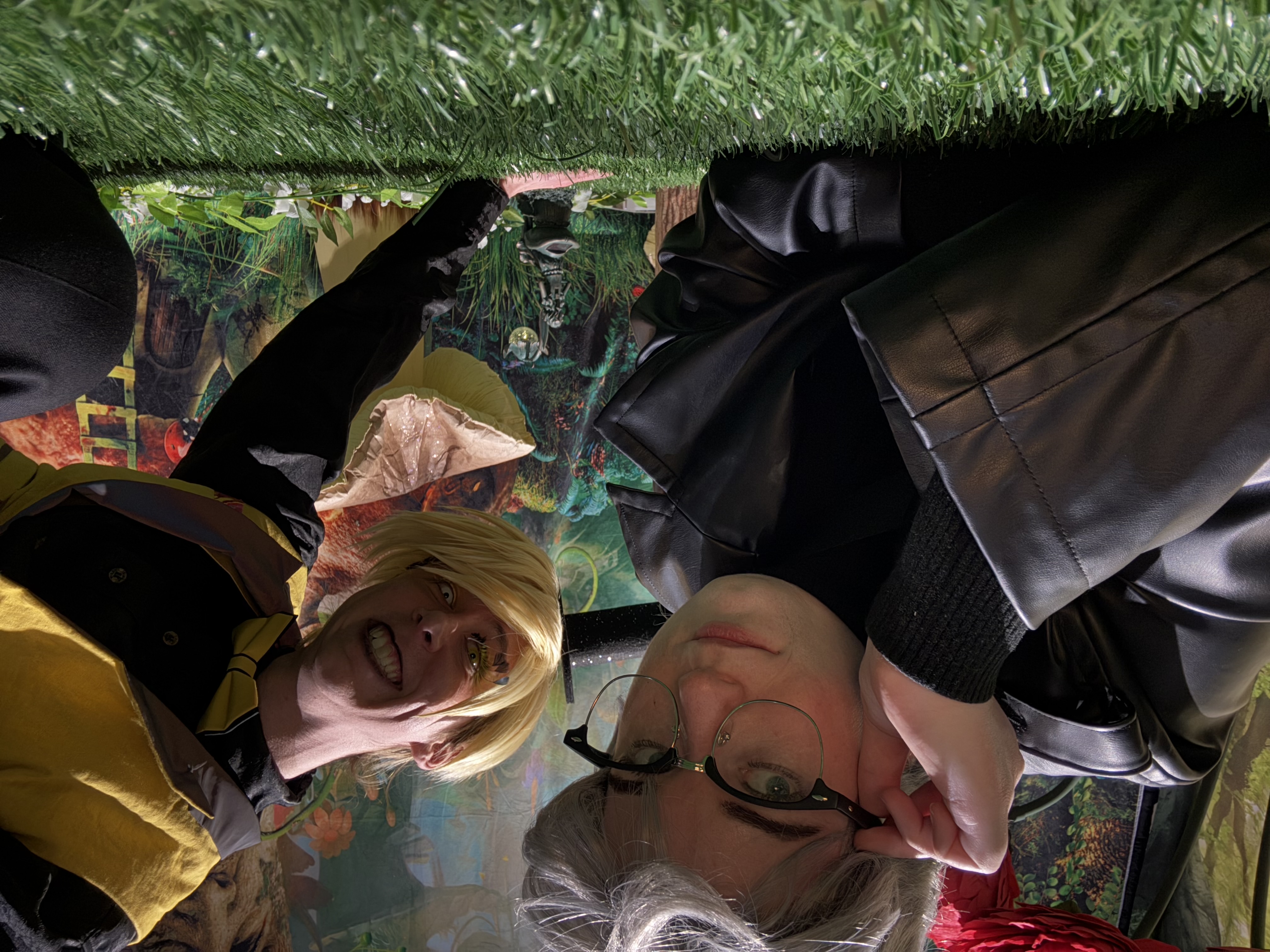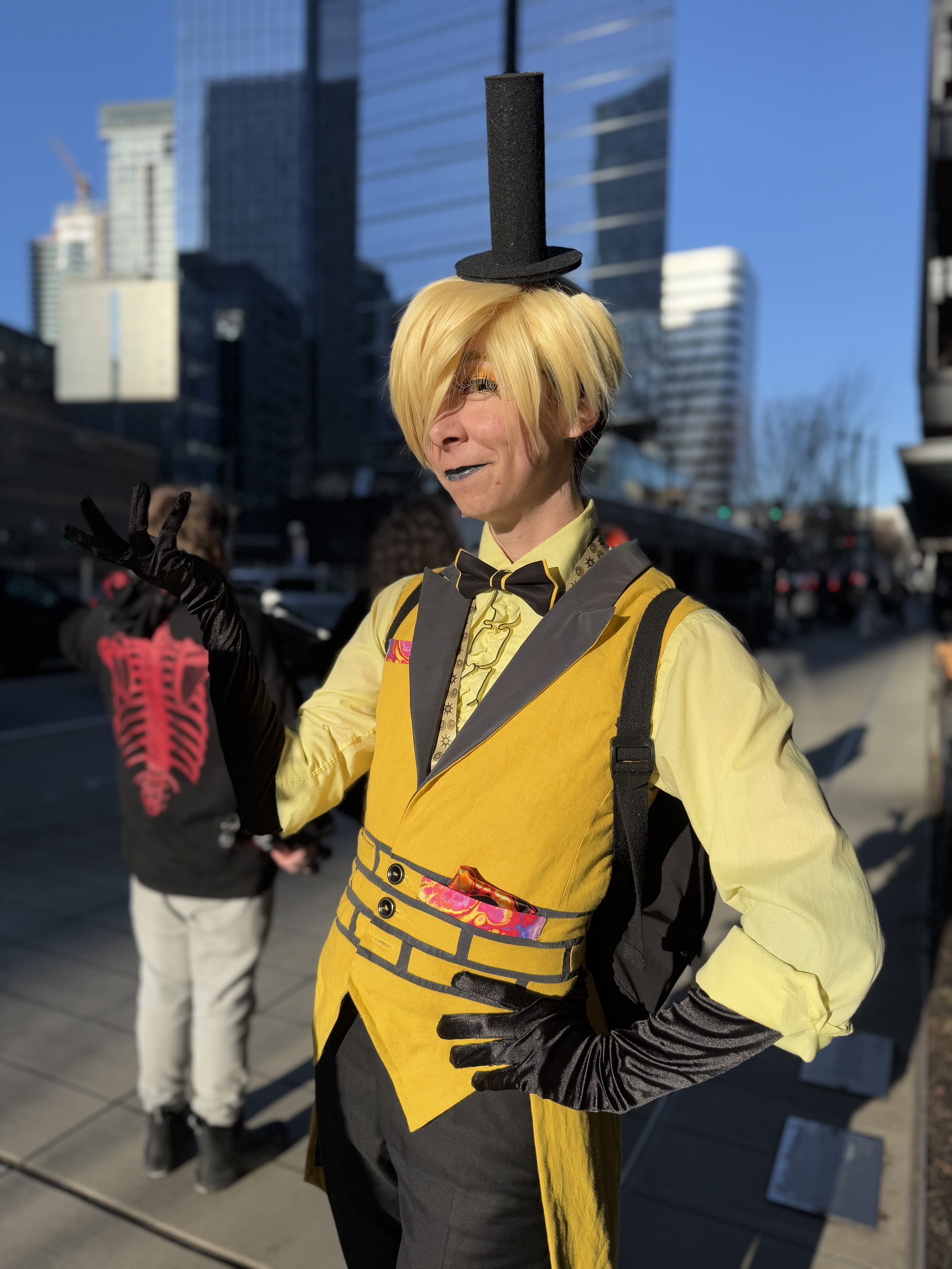 I cut individual "brick" pieces for the waist, then pressed and sewed them with the yellow folding under, so that the seams are hidden and the bricks are slightly raised off the reflective fabric. It has a nice dimensionality, exactly as I had in mind! Two of the bricks are welt pockets (one is obvious rainbow and one is hidden in a regular brick), which I learned how to make from the Alastor/Stolas vest, and I made an additional smaller breast pocket (measured to accommodate artist alley business cards specifically). The brick construction helped fix the waistline conundrum; the front points come down low enough to cover the waistband of my pants but I split the tails at the middle brick line so the waist/hip lines are much better from the back than a lower waist would've looked.