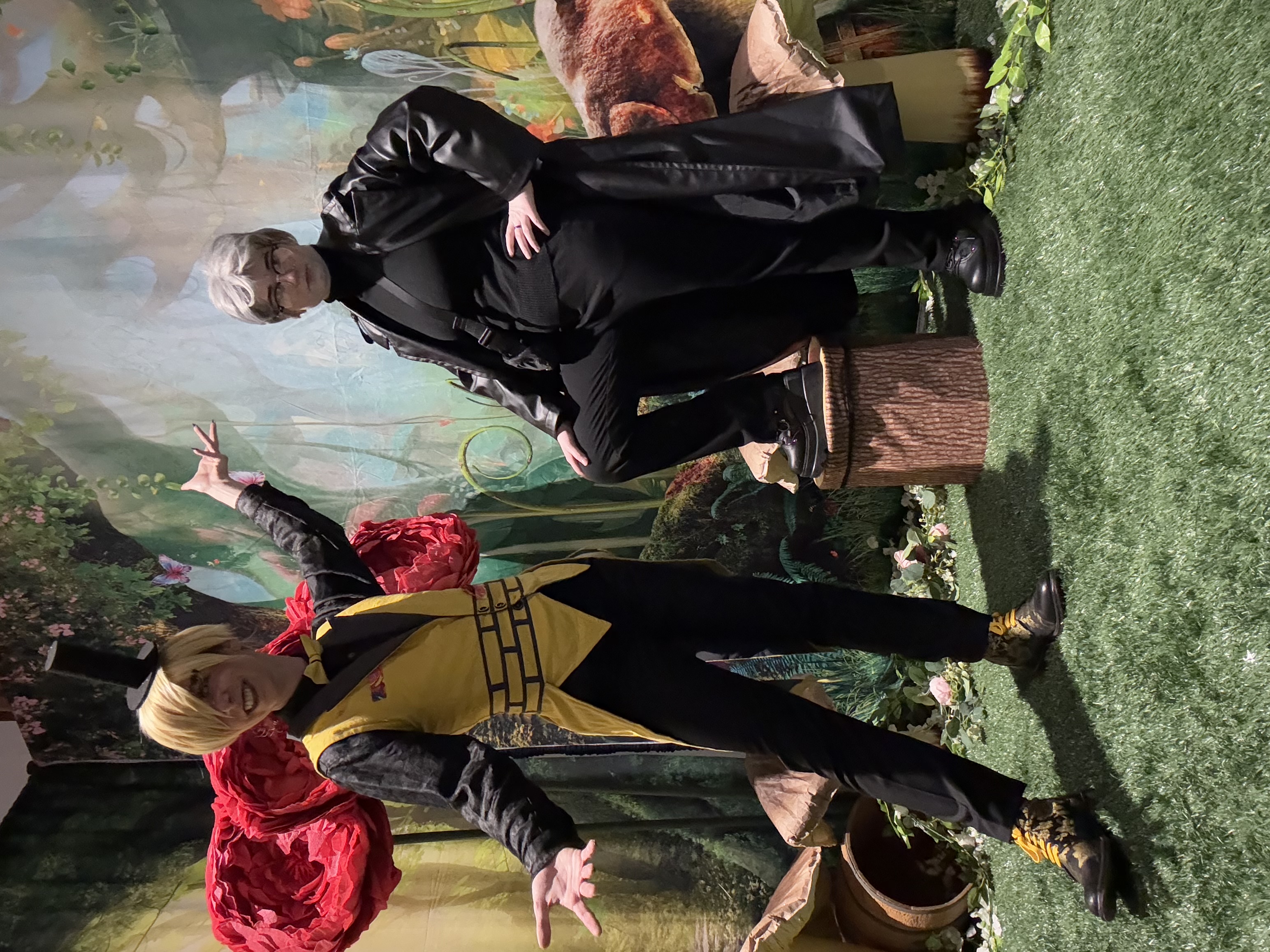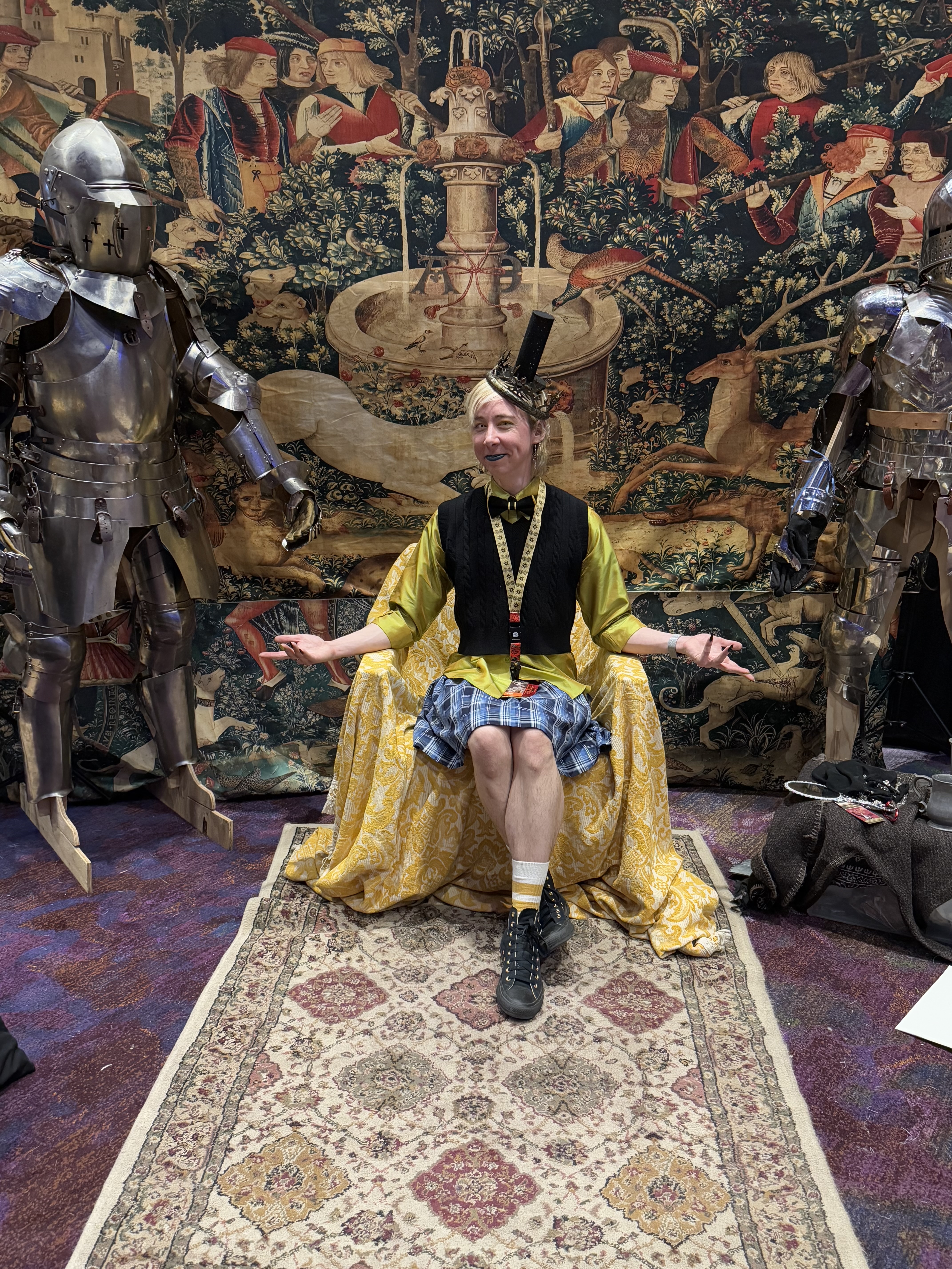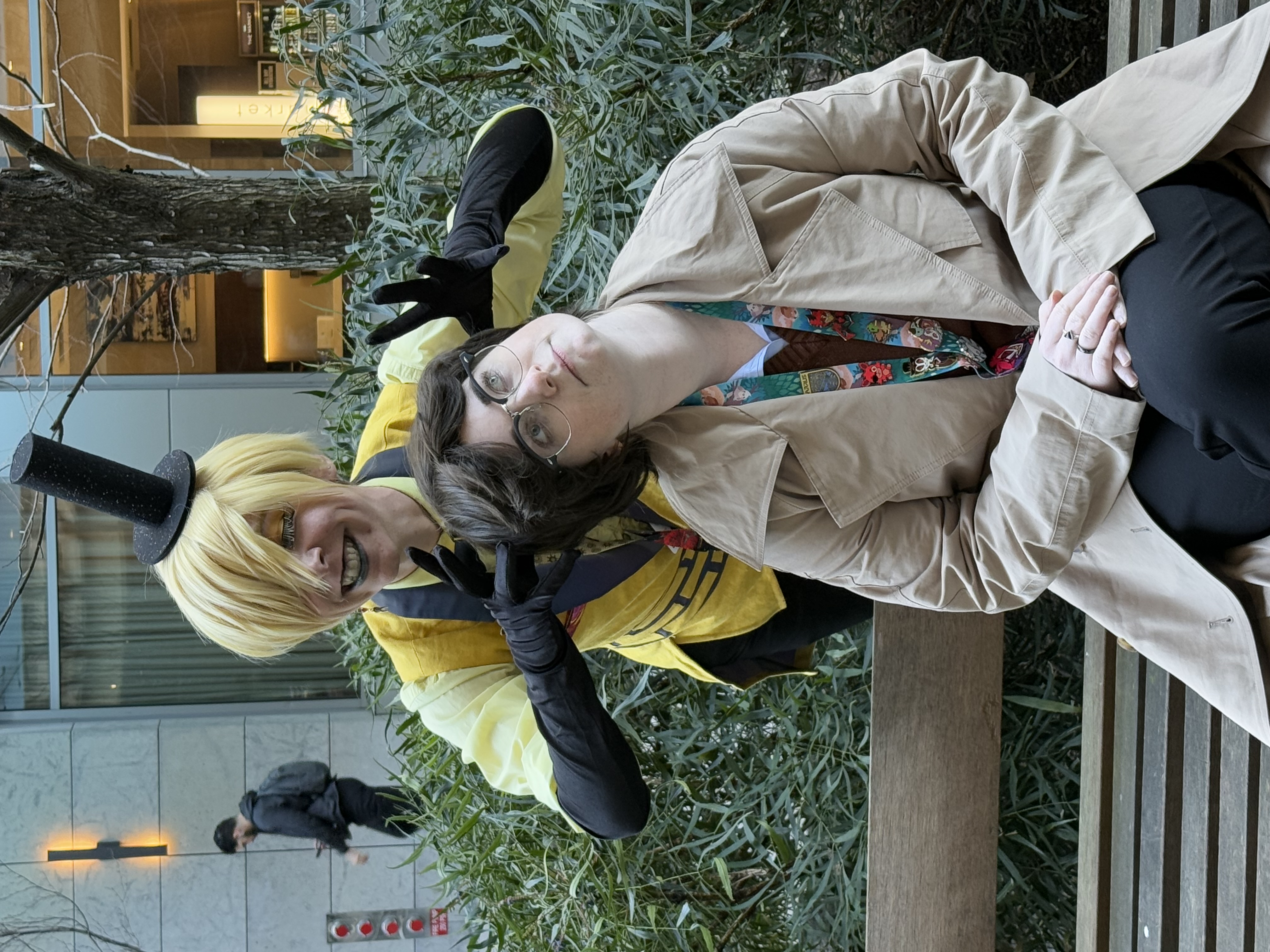 I cut individual "brick" pieces for the waist, then pressed and sewed them with the yellow folding under, so that the seams are hidden and the bricks are slightly raised off the reflective fabric. It has a nice dimensionality, exactly as I had in mind! Two of the bricks are welt pockets (one is obvious rainbow and one is hidden in a regular brick), which I learned how to make from the Alastor/Stolas vest, and I made an additional smaller breast pocket (measured to accommodate artist alley business cards specifically). The brick construction helped fix the waistline conundrum; the front points come down low enough to cover the waistband of my pants but I split the tails at the middle brick line so the waist/hip lines are much better from the back than a lower waist would've looked.