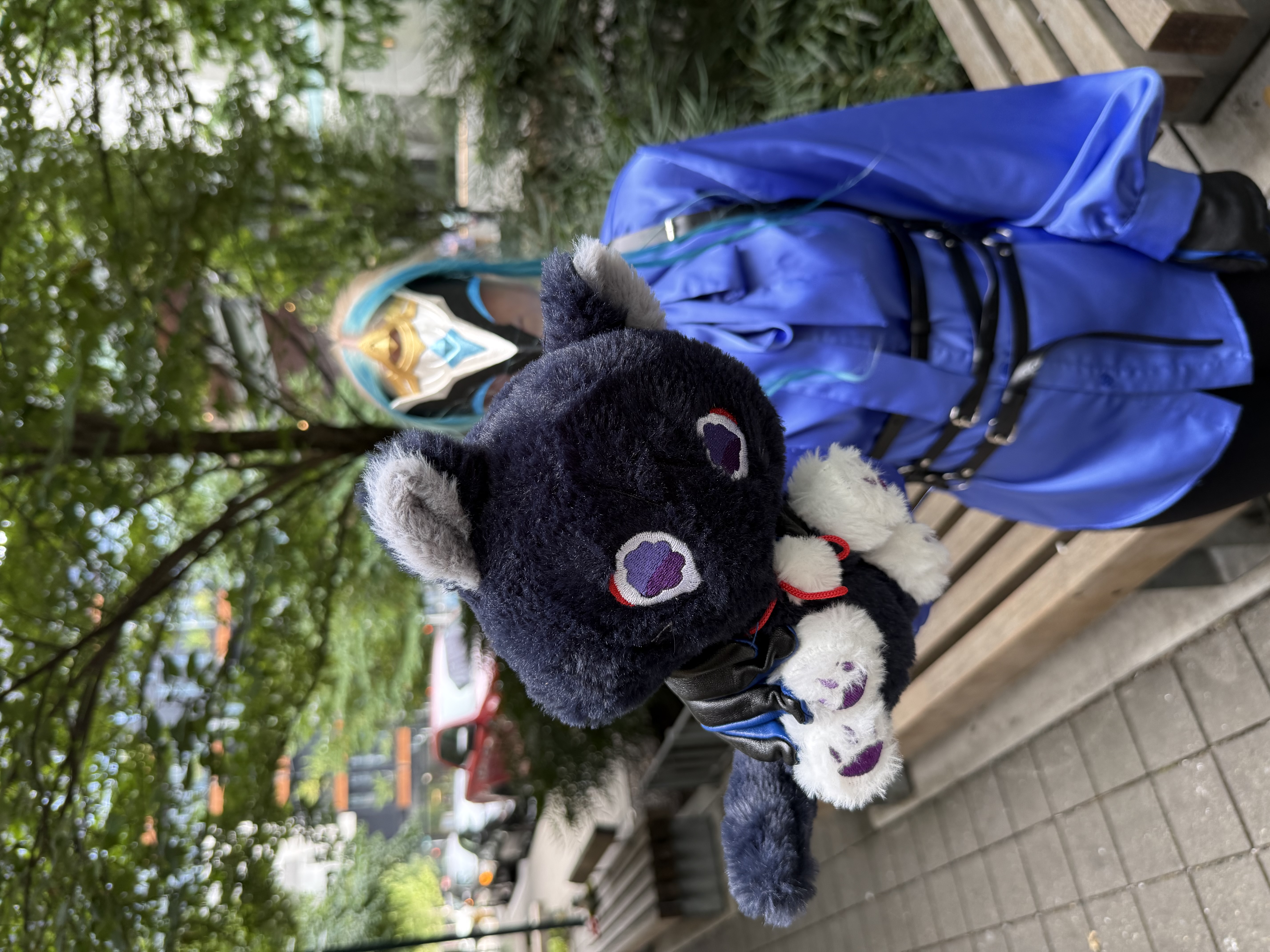 It will be noted that this cosplay so far does not include a wig, as I usually keep my hair blue and I thought yeah sure close enough. I have worn this cosplay with a couple different clip-in extensions for the long front bang. The nice real-hair beach-curl one looks best but it doesn't always match my hair color, plus having a cosplay that depends on a specific hair color and length is a little bit restrictive. It's clear that at some point I have to cave and style a wig for this.