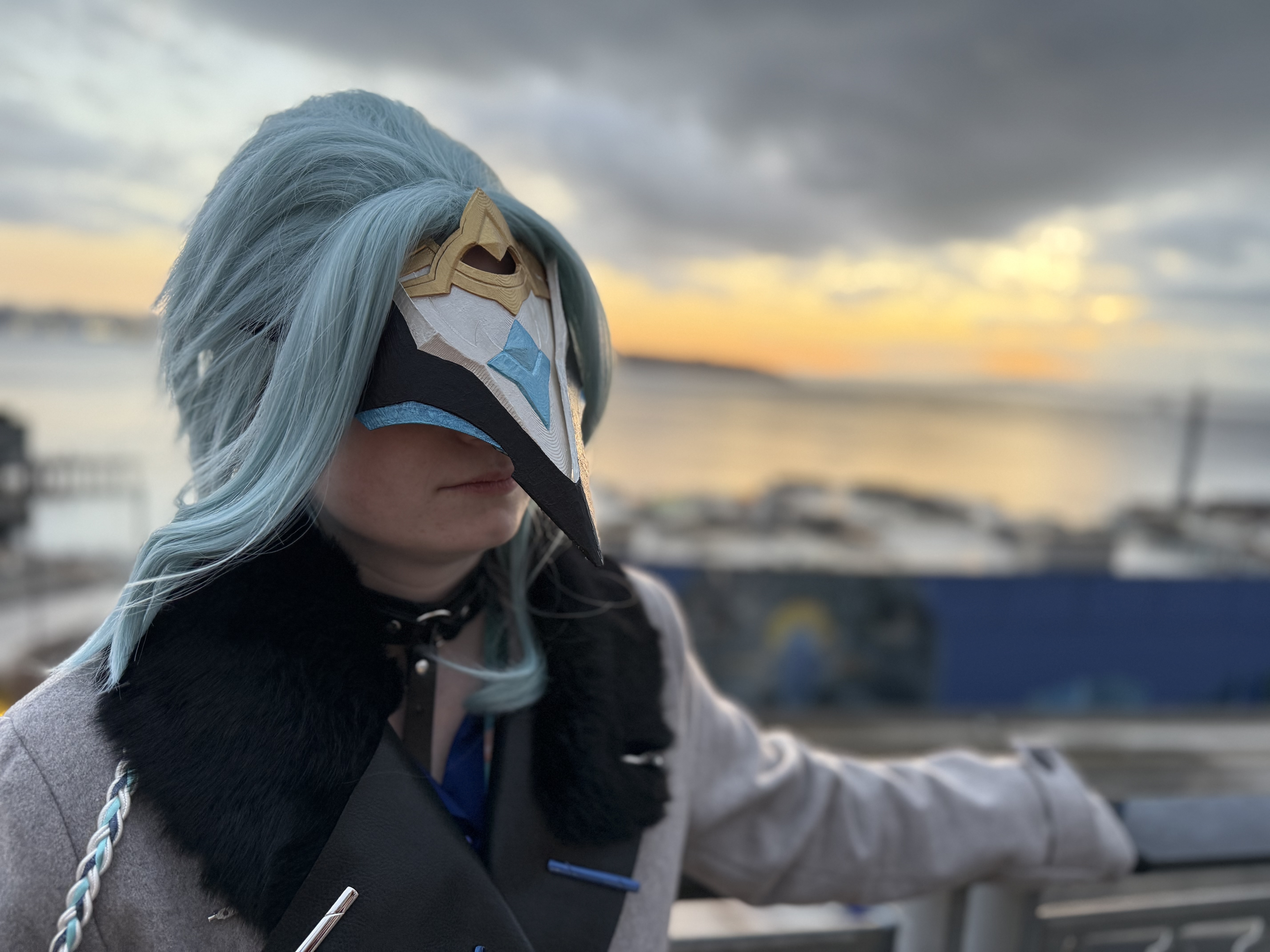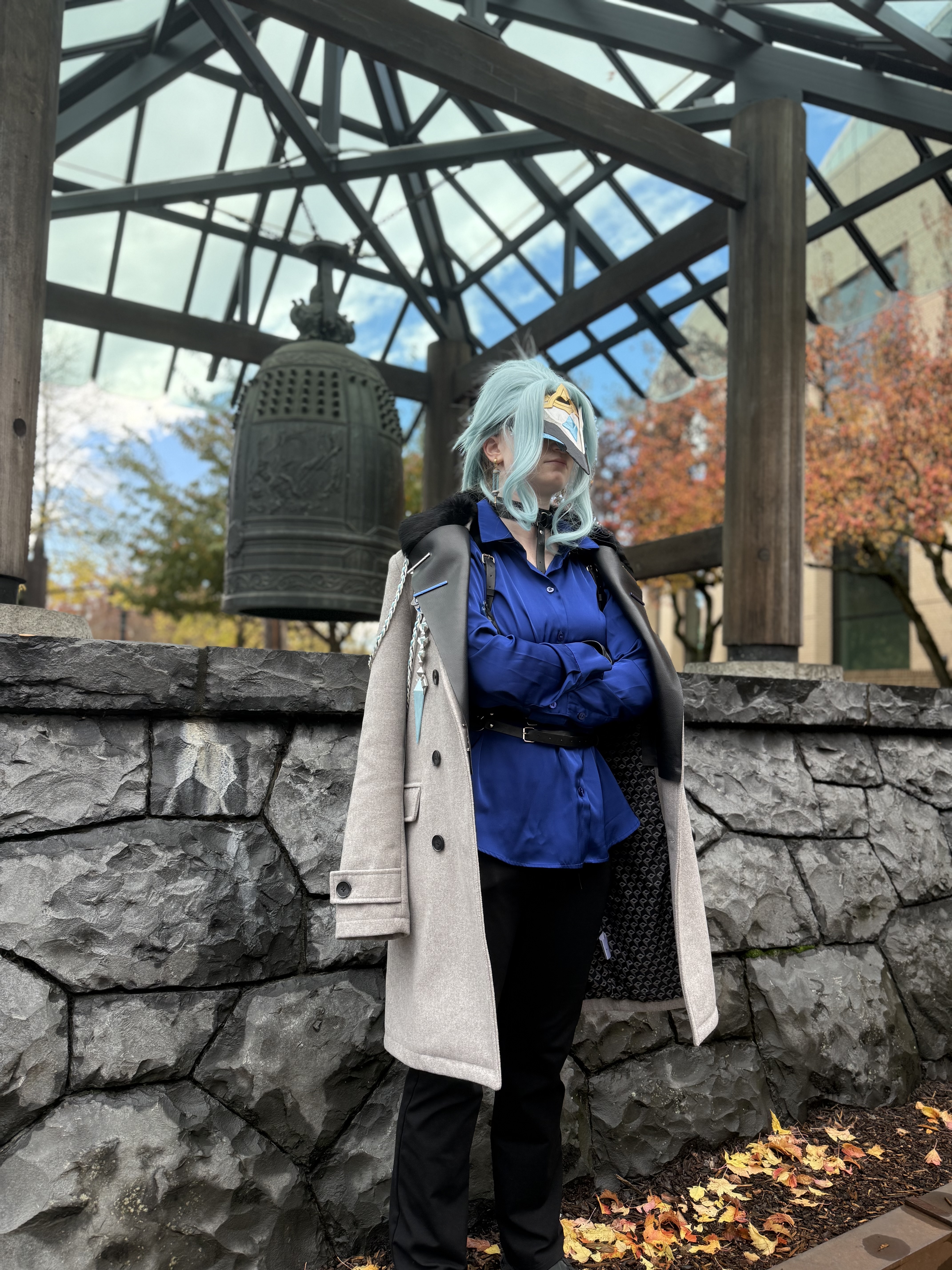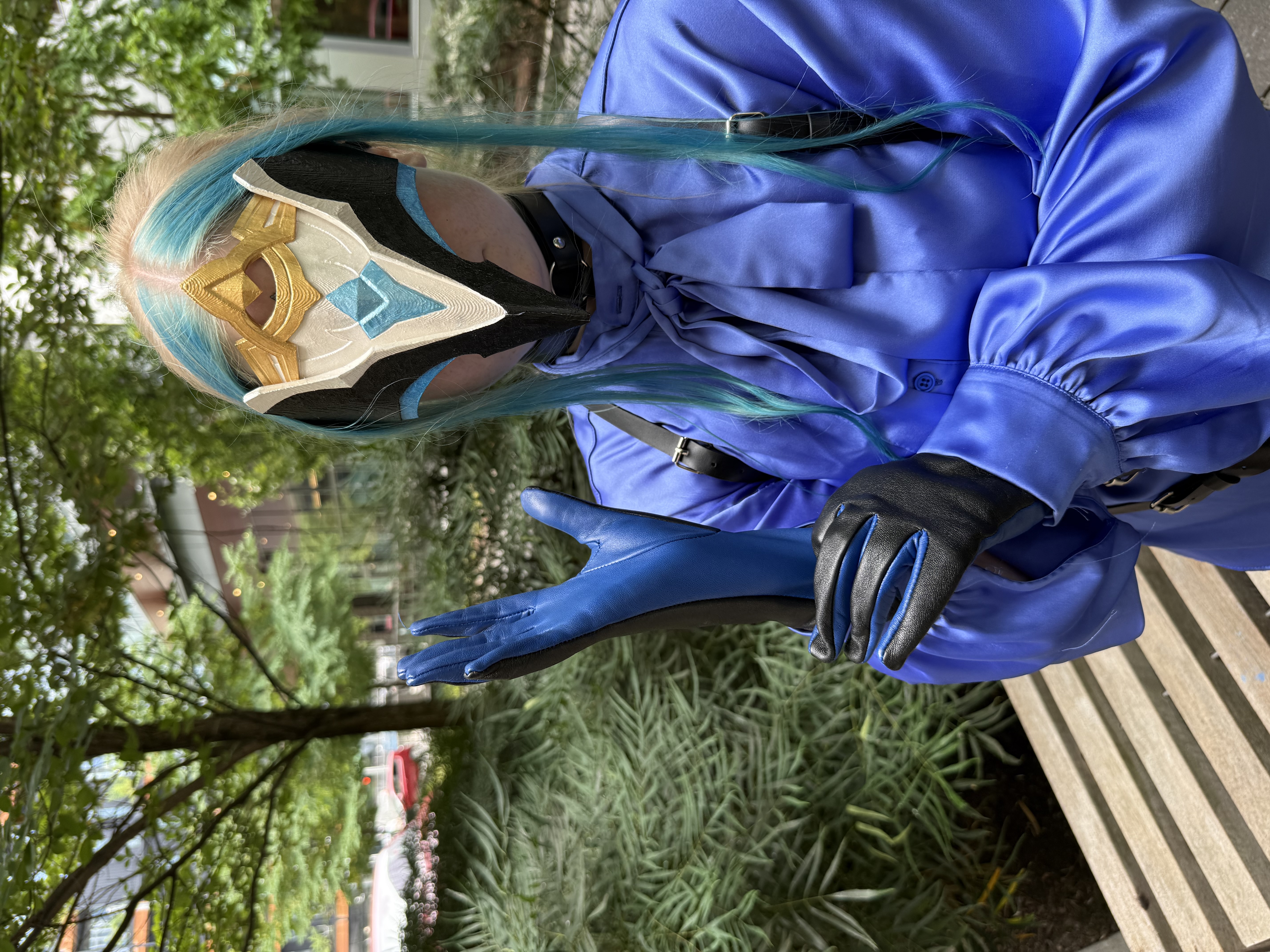 The rest of the ensemble was fairly straightforward: satin shirt (I'd love to replace this with a more true-blue shirt-cravatte combo at some point, perhaps adding some of the gold edge detailing present on the Omega model), gray pants, strappy harness, black boots (I have, currently, no desire to make cosplay footwear, but if I did, the Dottore boots would be high on my priority list to customize). I wear a navy vest to add a darker blue hue since the blue in my shirt is a little light, and because the Webttore outfit includes a vest. I had leather gloves custom-made with blue palm detailing, and found an Etsy maker selling earrings made of upcycled fuses filled with colored goo, which make the perfect Dottore earring thematically and visually. His canon earring appears more syringe-like, but I like the fuse capsule, since he is primarily an engineer/roboticist, not a biologist or chemist.