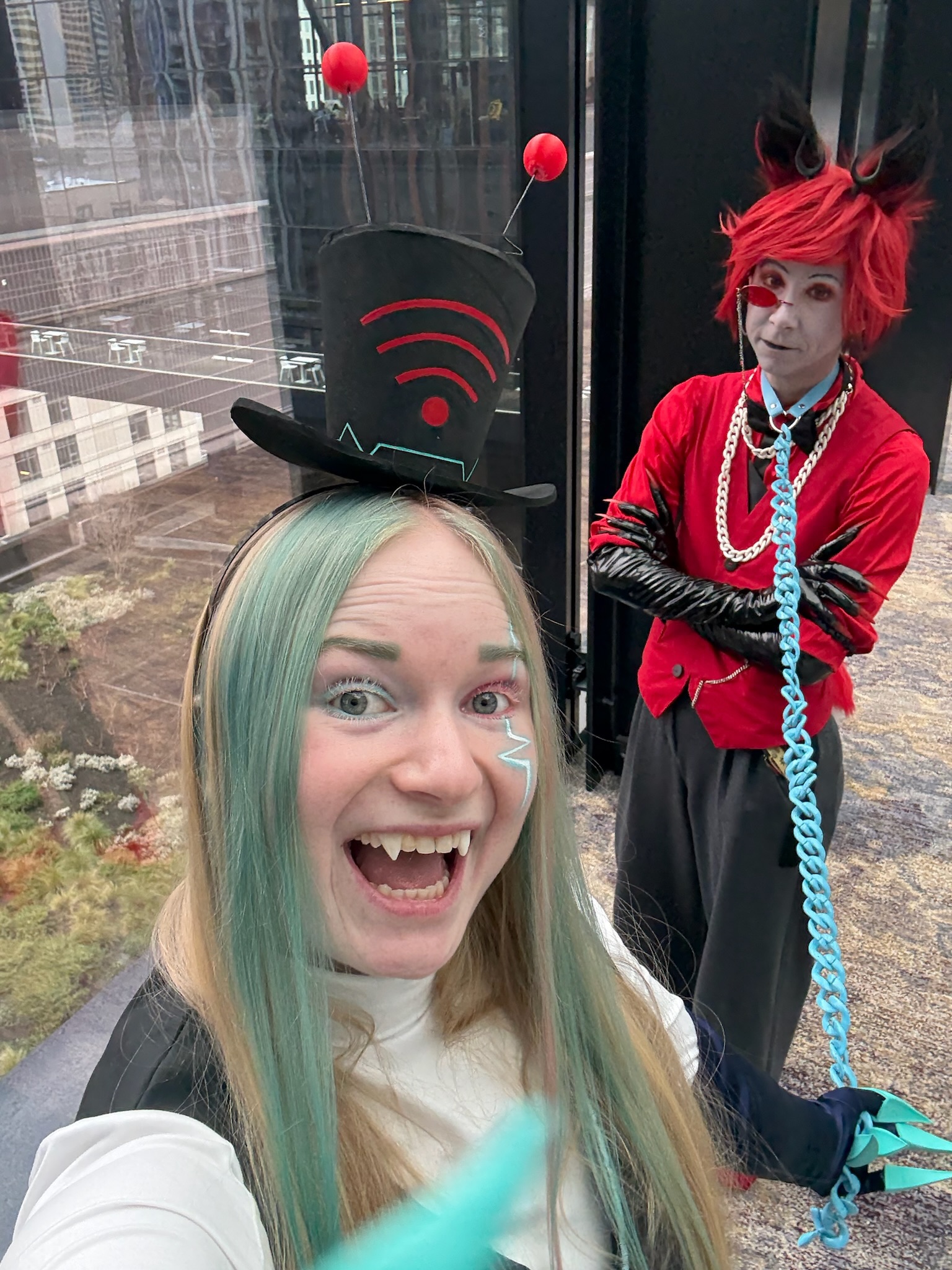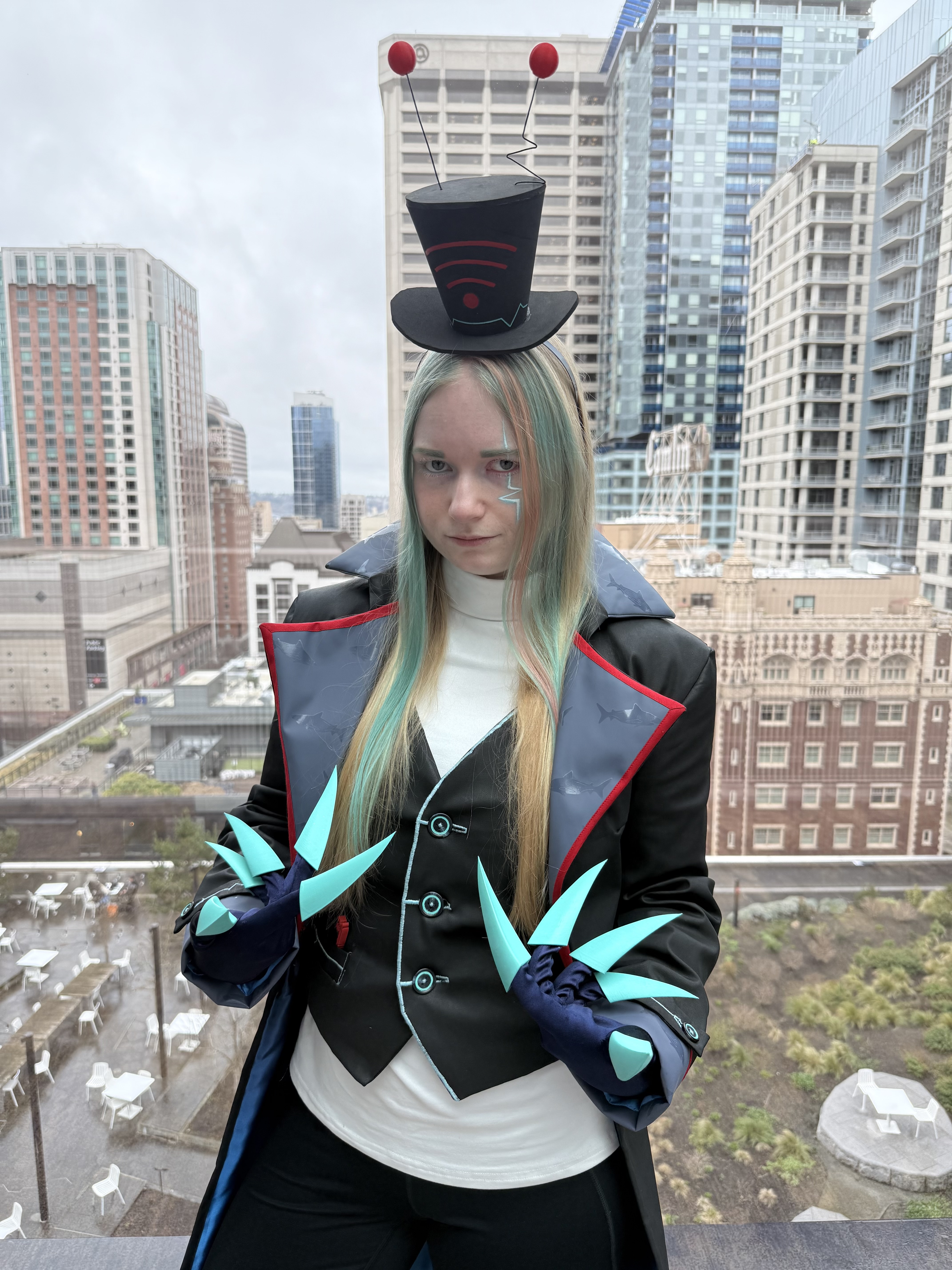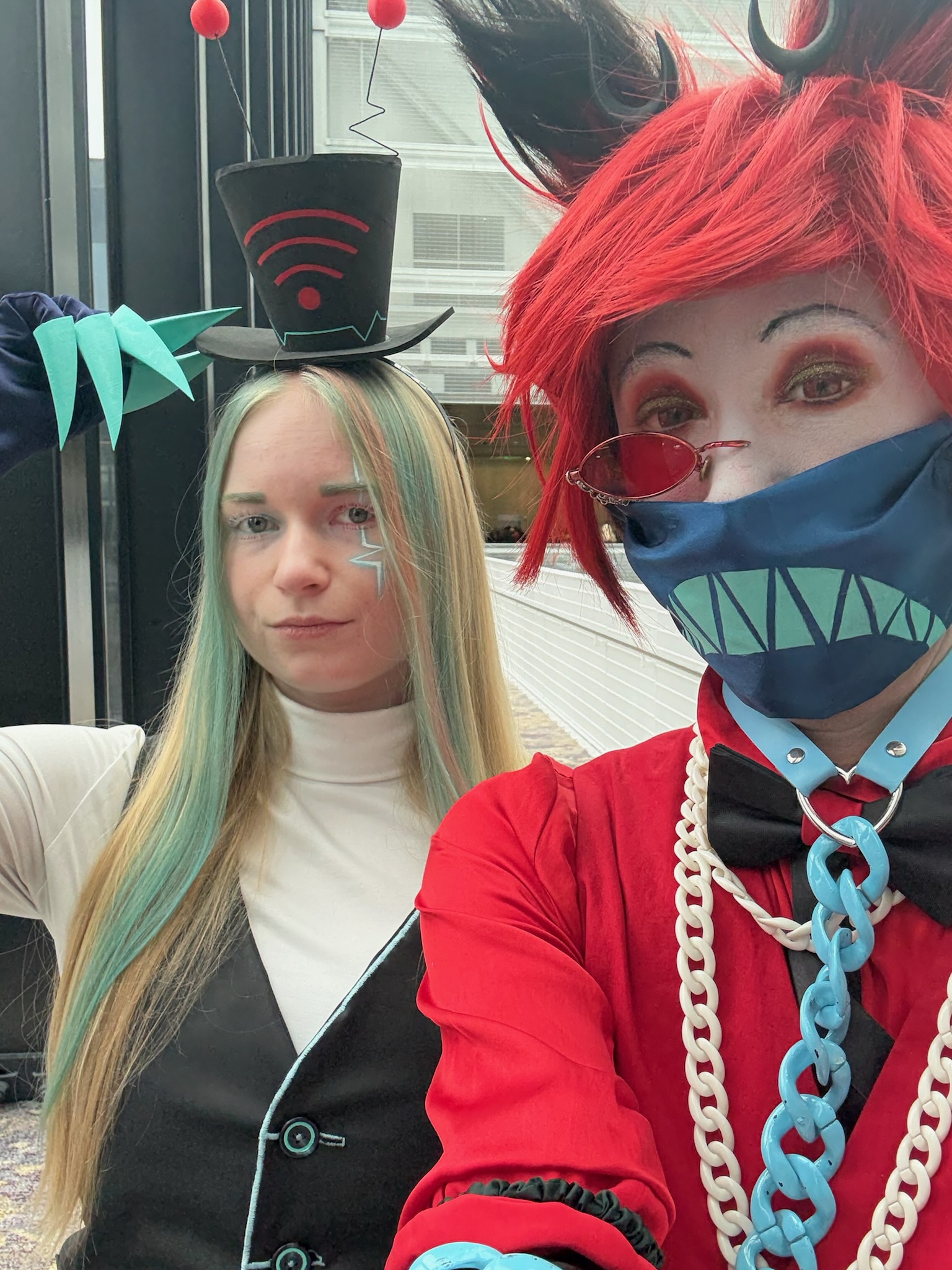 Vox was a commission from my partner Kay (@demonfoxcosplay). I, of course, care a great deal about Hazbin Hotel, and Kay and I met while both cosplaying Alastor, so this was sort of a full-circle moment for us. Alastor/Vox (namely Stayed Gone) is most of the reason I went back to Hazbin Hotel after bouncing off the first episode. Season 2 spent a lot of time on Alastor and Vox's relationship, so our mutual enthusiasm was rejuvenated.