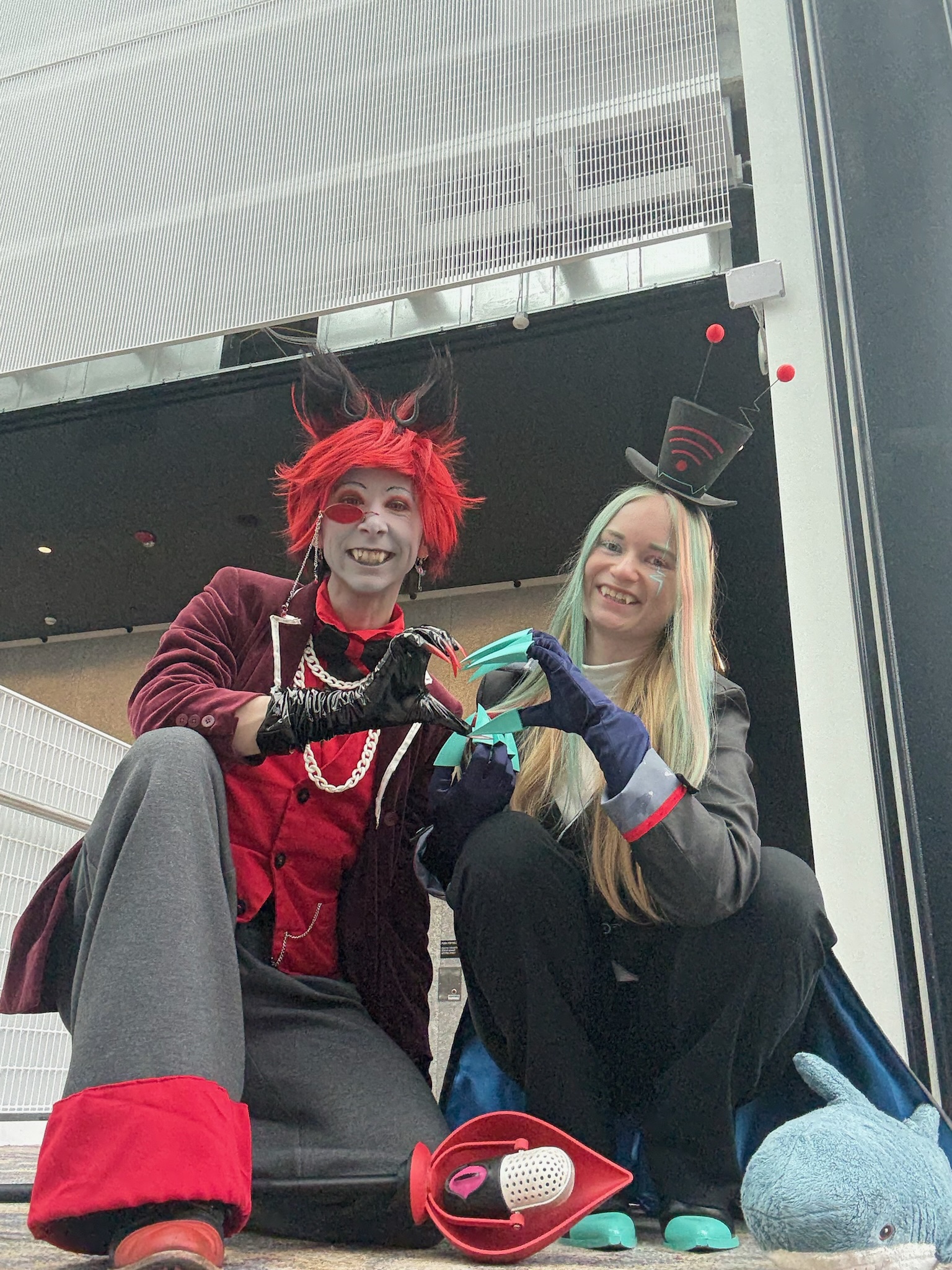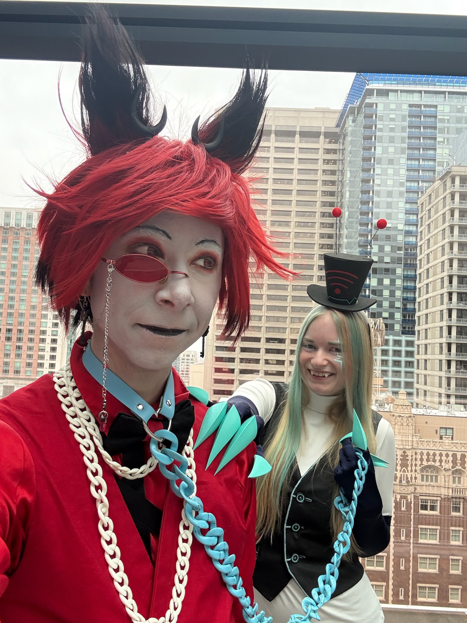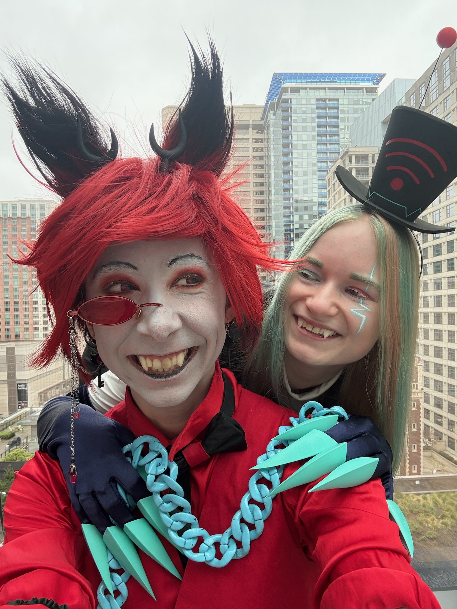 Vox was a commission from my partner Kay (@demonfoxcosplay). I, of course, care a great deal about Hazbin Hotel, and Kay and I met while both cosplaying Alastor, so this was sort of a full-circle moment for us. Alastor/Vox (namely Stayed Gone) is most of the reason I went back to Hazbin Hotel after bouncing off the first episode. Season 2 spent a lot of time on Alastor and Vox's relationship, so our mutual enthusiasm was rejuvenated.